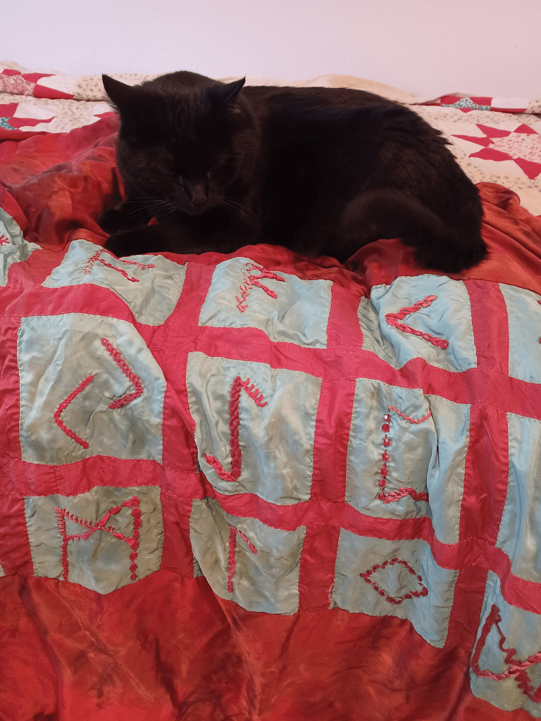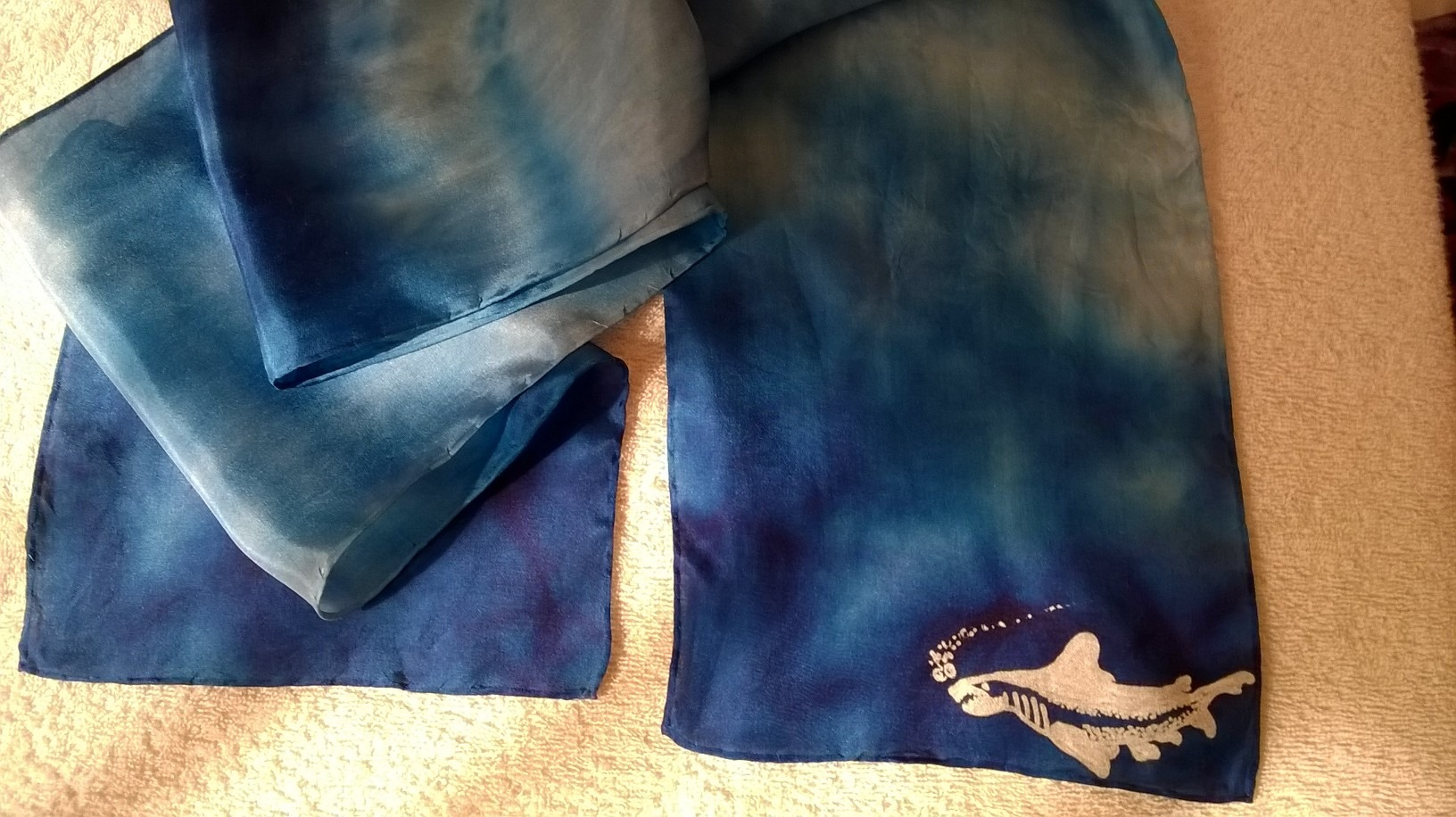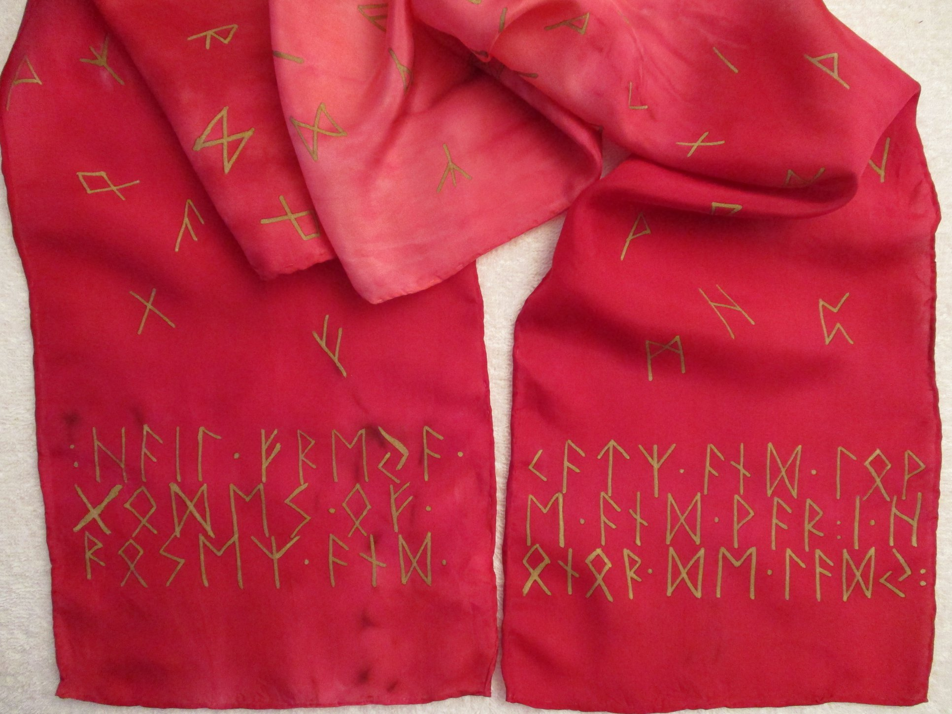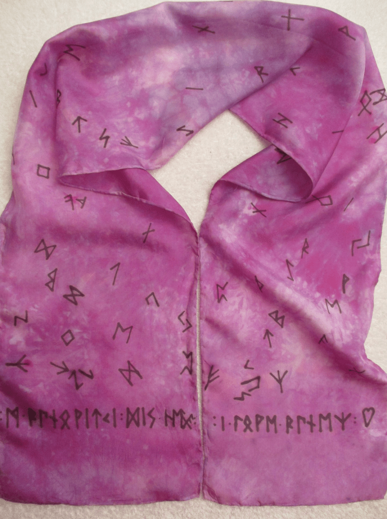 Although I am no longer operating the dyeworks, I do still have several hand dyed silk scarves available, either to decorate into Rune Scarves or use without added decoration. All my silk was purchased before the “silk problem” started. The scarves have hand rolled edges sewn with silk thread.