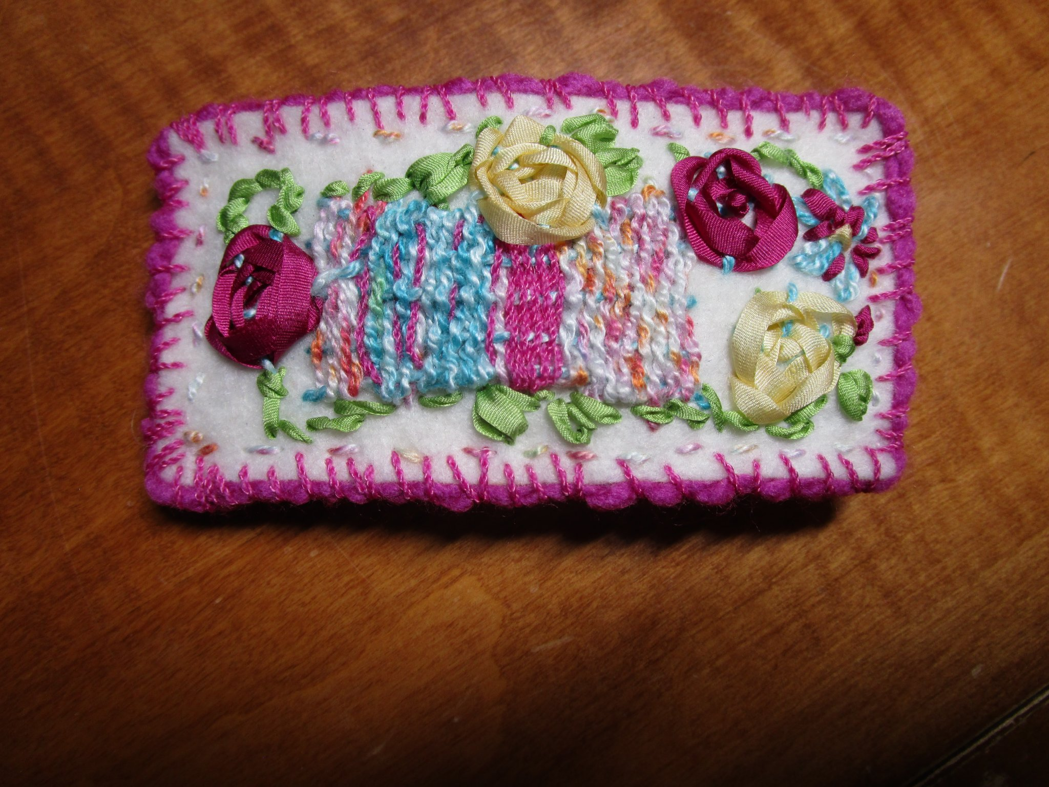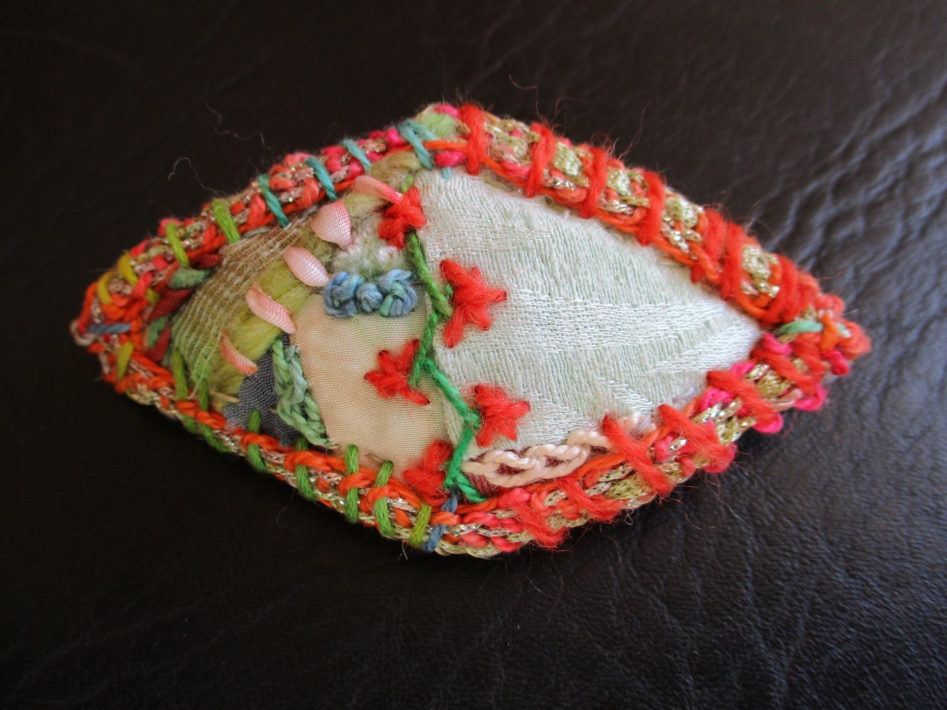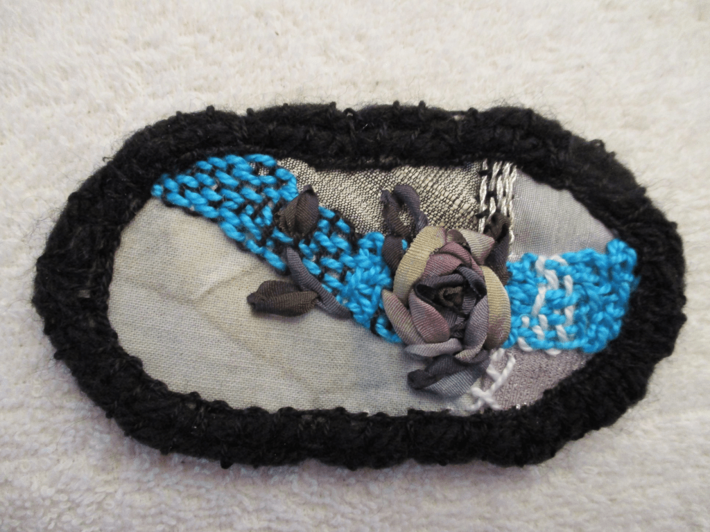 Made from both handmade and upcycled fabrics and trims, especially the hand dyed silk fabrics, yarns, and ribbons by Magicalrealistartist. The upcycled items are small waste fibers and scraps from local quilters, crocheters, tatters, and knitters.