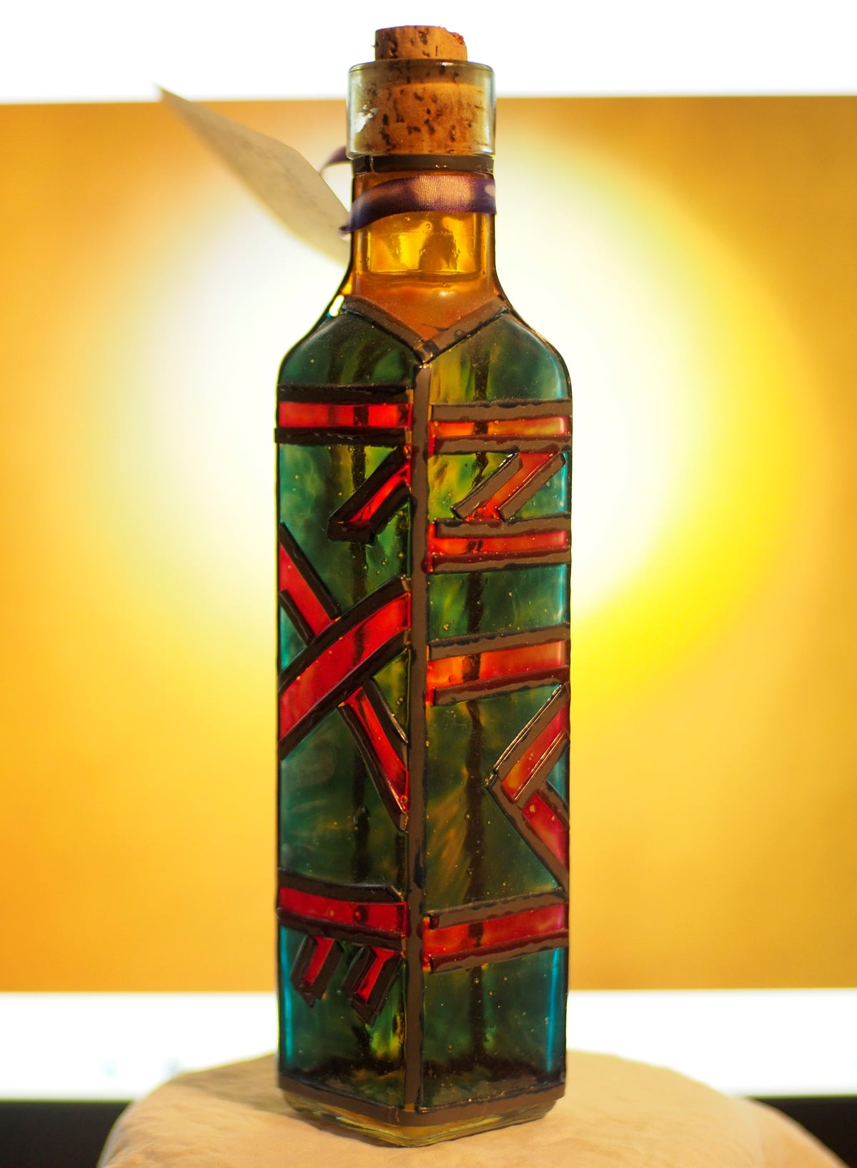 I also made painted glass at one time and am considering taking it up again to decorate perfume bottles. Here is an example of a glass bottle I made to hold my home made whiskey, Northern Lights Goddesses Brew: